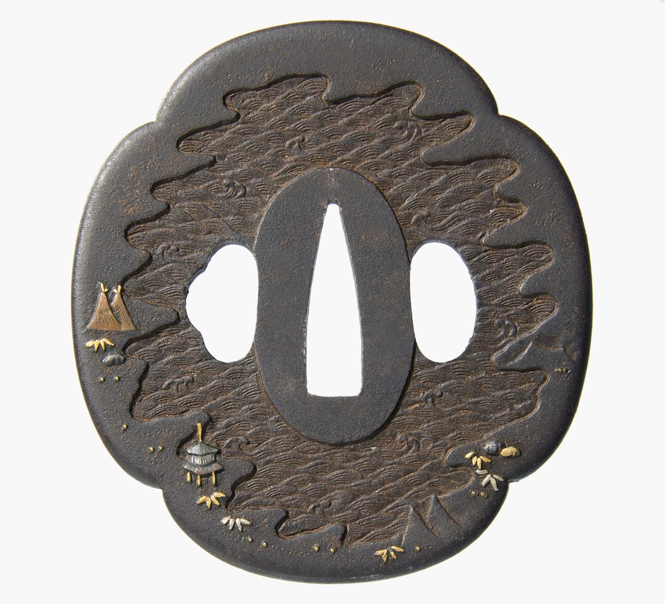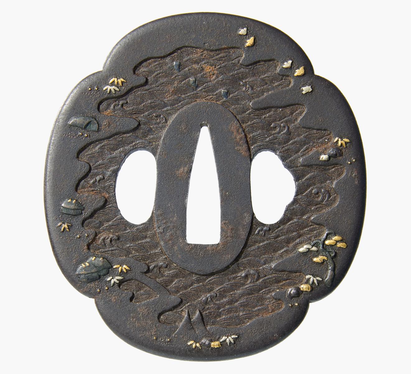 Beschreibung: Eine Uferlandschaft mit Hütten, Kiefern, Bambus und Vögeln als iroe-hirabori auf
