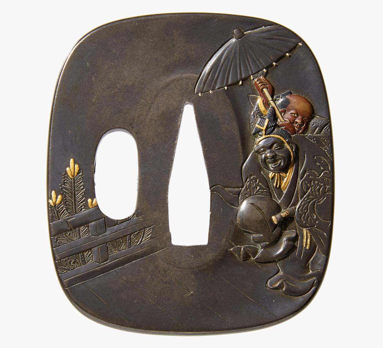 TSUBA. SCHAUSPIELER UND KIEFER. SHIBUICHI. SIGN.: GYOKURYÛKEN NOBUKATSU.