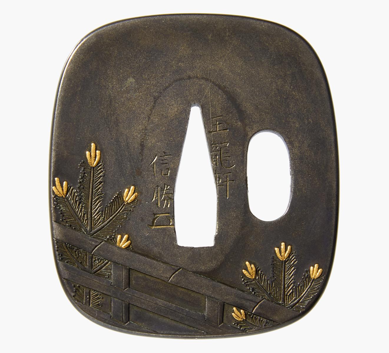 und akagane auf einer von Kiefern umgebenen Bühne in hirabori mit Details in Gold.