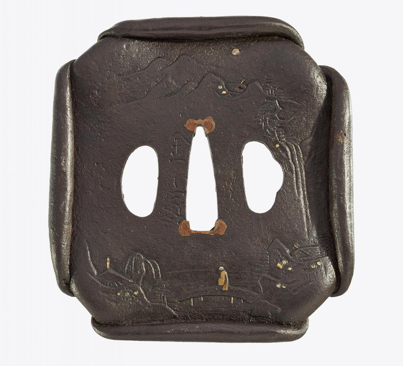 Beschreibung: In feinem Flach-Relief mit Einlagen aus Kupfer und Silber Wanderer auf einer Brücke über