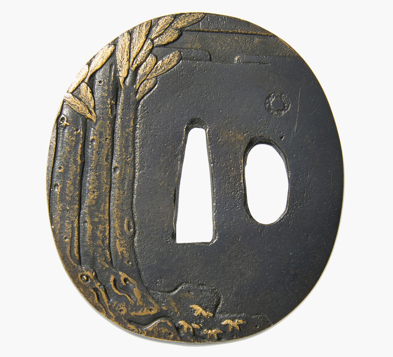 Beschreibung: Auf teils punziertem Fond als hirabori mit Details in Gold-nunome und shibuichi. Der