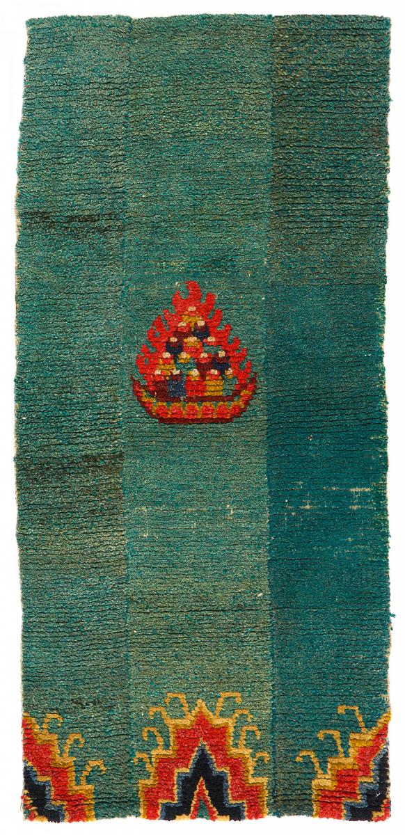 Beschreibung: Auf jadegrünem Fond im Zentrum eine Schale mit flammenden Perlen unten drei Darstellungen