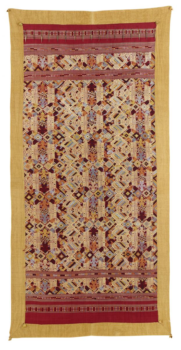 Technik: Naturfasern/Viskose, leinwandbindig mit broschierten Mustern; in den Ecken kleine Quasten mit Papier; Anhänger aus Silber.