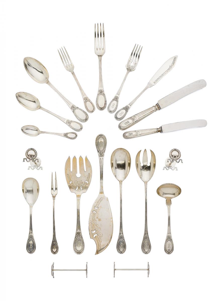 UMFANGREICHES SPEISEBESTECK MIT BIEDERMEIERDEKOR FÜR ZWÖLF PERSONEN.