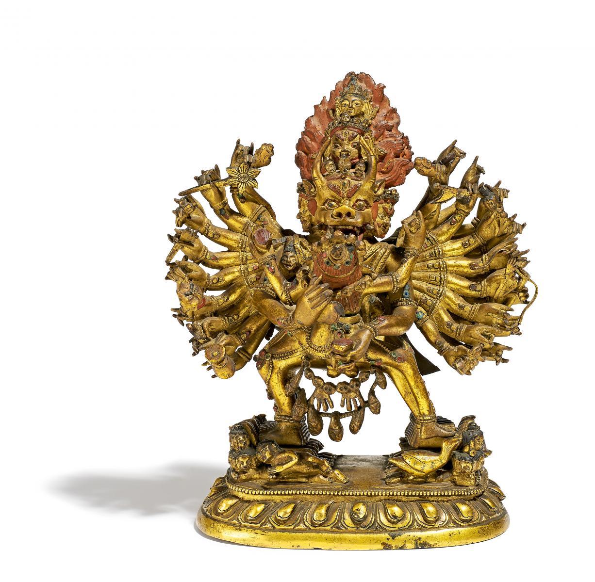 Beschreibung: Entsprechend der Ikonografie dargestellt mit einem Büffelkopf sowie acht weiteren Köpfen. In seinen 34 Armen hält er zahlreiche Attribute, die teils separat gefertigt und lose in den Händen gehalten sind. Ebenso lose und beweglich ist der Schurz aus Köpfen, Schädeln und abgeschlagenen Händen. Mit seinen 16 Füßen trampelt er auf göttlichen, menschlichen und tierischen Wesen. In enger Umarmung hält er vor sich seine Gefährtin Vajravetali, eine zornvolle Form von Sarasvati, die eine Schädelschale und ein katrika-Hackmesser präsentiert. Der separat gegossene Sockel vermutlich original verschlossen.