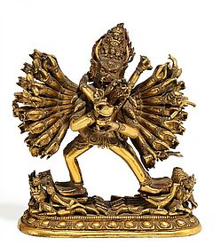 Beschreibung: Vajrabhairava (sanskrit yamantaka, tib. shinje che) in 34-armiger Form in yabyum mit Vajravetali. In seinen Hauptarmen hält er das Hackmesser (kartrika) und die Schädelschale (kapala). Er ist mit neun Köpfen gezeigt und loderndem Haar. Er steht im Seitenschritt nach rechts, auf dieser Seite auf sechs Tieren, einem Menschen und vier göttlichen Wesen, eines davon dreiköpfig. Mit den linken Beinen steht Vajrabhairava auf acht Vögeln und vier Hindugöttern, darunter der elefantenköpfige Ganesha