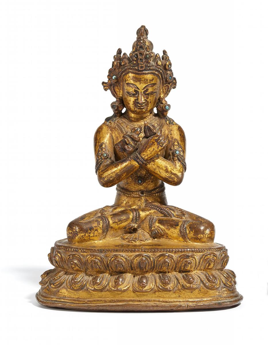 Beschreibung: Mit siebenteiligem Bodhisattva-Schmuck, sitzend auf einem Lotossockel. In den Händen