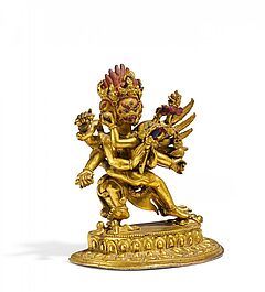 Beschreibung: Die dreiköpfige zornvolle Gottheit mit Flügeln und in yab-yum mit seiner Partnerin Dipta