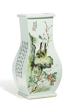 Beschreibung: Rechteckige Vase mit ausladendem Bauch auf kurzem Standfuß. Vorder- und Rückseite jeweils