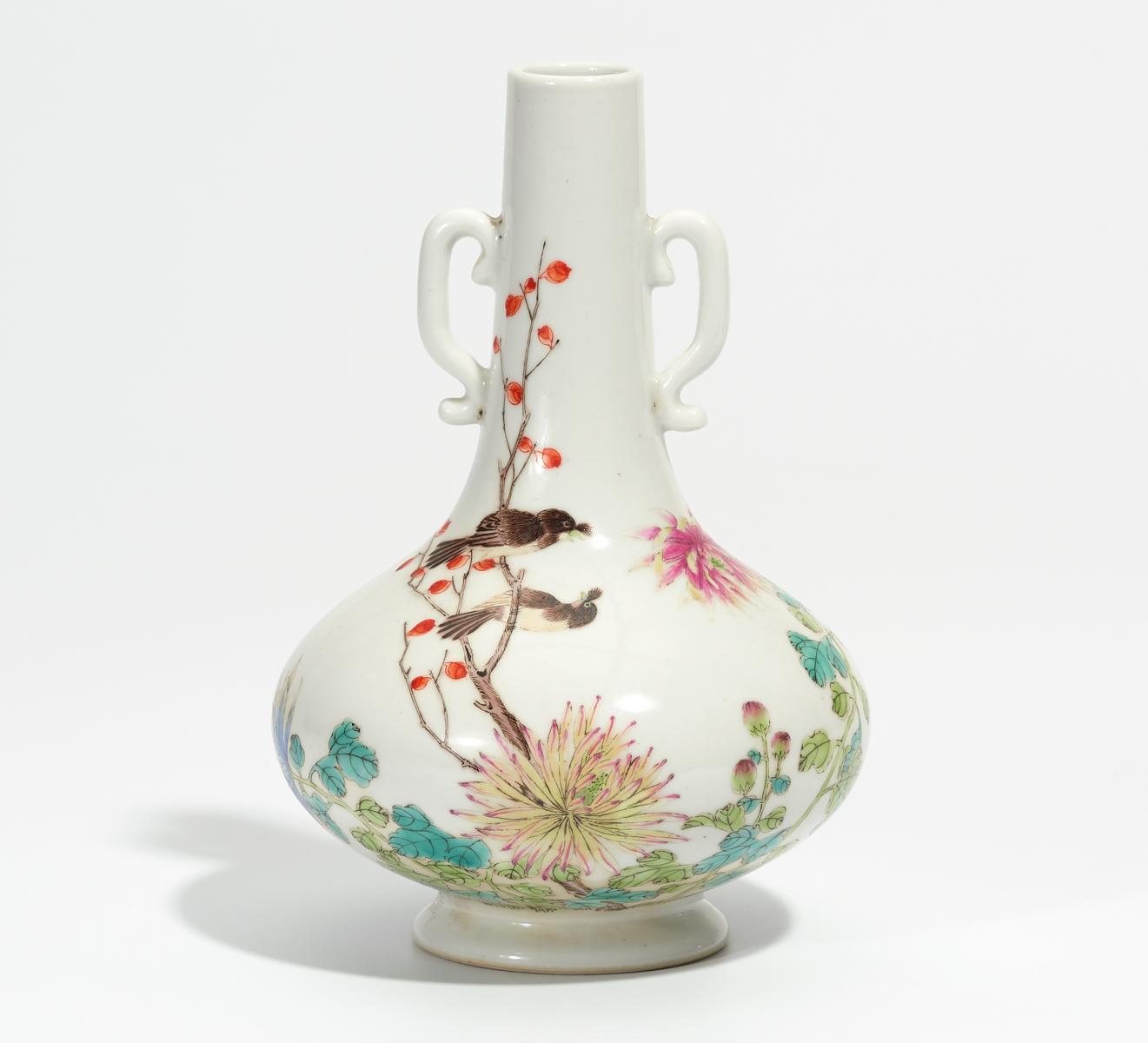 Beschreibung: Vase in Wasserkastanien-Form (biqi ping) mit zwei Henkeln am Hals, auf ausgestelltem