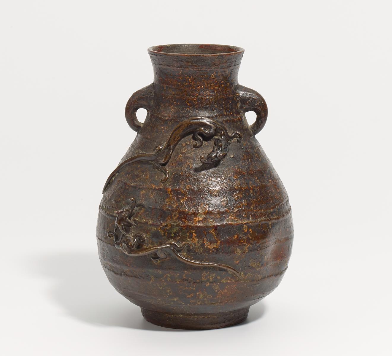 VASE MIT ZWEI PLASTISCHEN REGENDRACHEN.