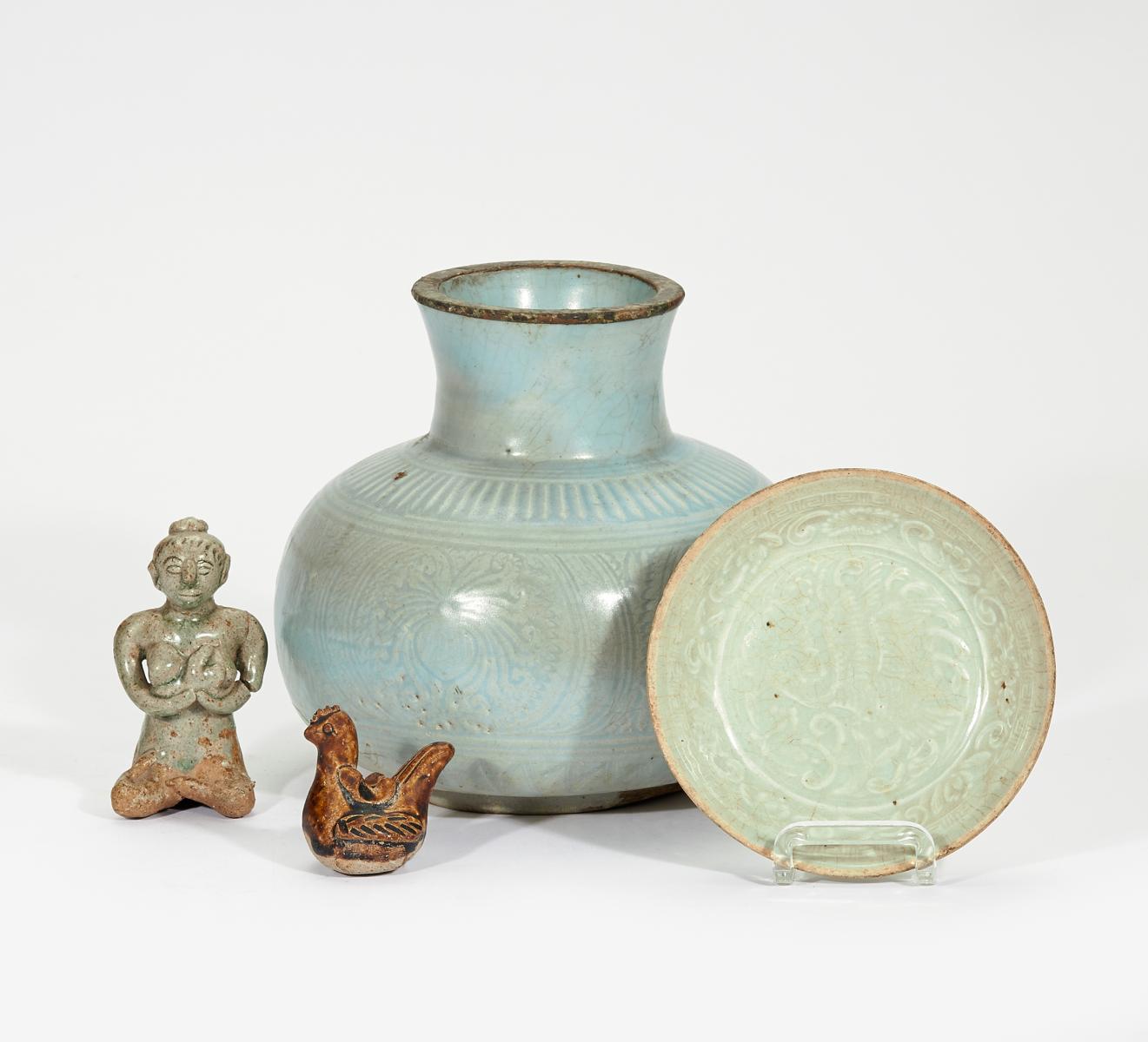 VASE, TUKATHA FIGUR EINER STILLENDEN FRAU, KLEINE VOGELFIGUR UND QINGBAI-TELLER.