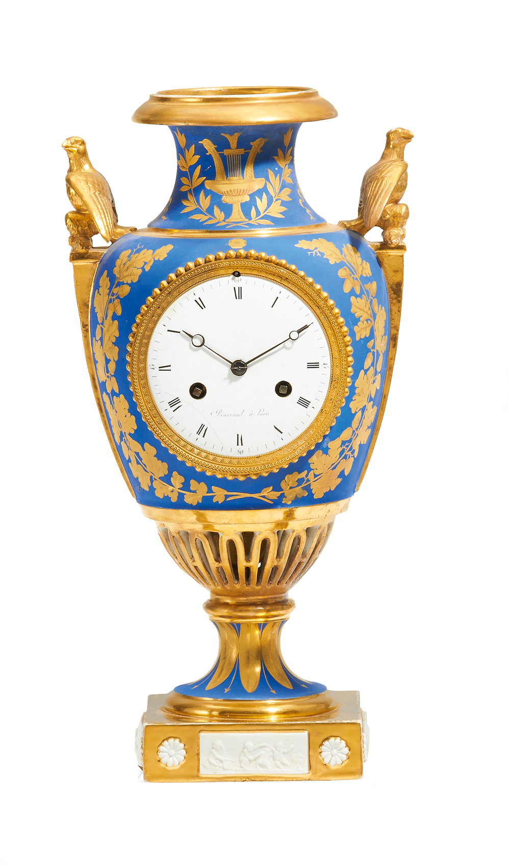 Porzellan gold und farbig staffiert. Vergoldeter Bronzering und Emailzifferblatt. Balusterform mit Adlergriffen. Rundes Werk in einer Büchse. Römische Ziffern und arabische