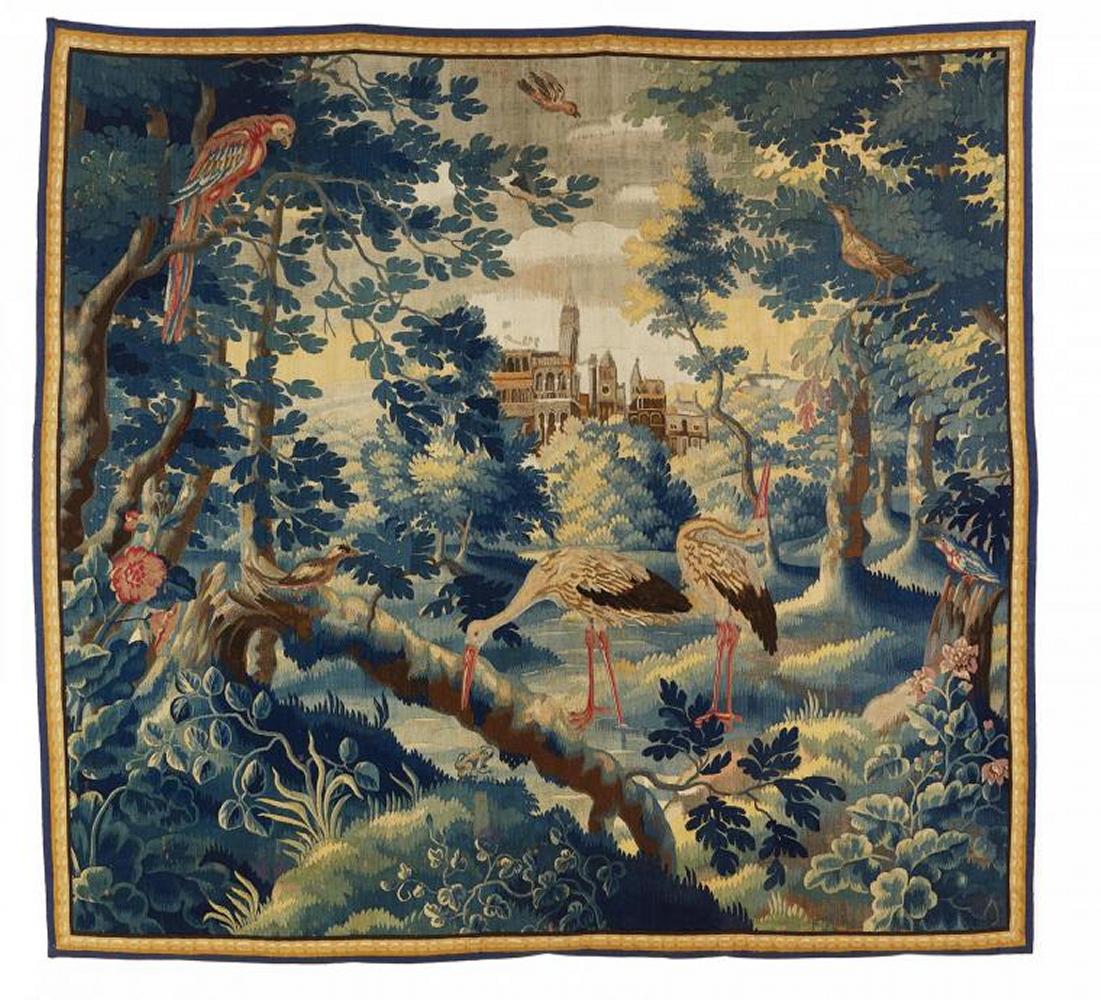 Wolle und Seide in dezenter Polychromie. Waldlandschaft mit Storchenpaar, Papagei und anderen Vögeln. Im Hintergrund Architektur. 222x243 cm. Zustand B/C.