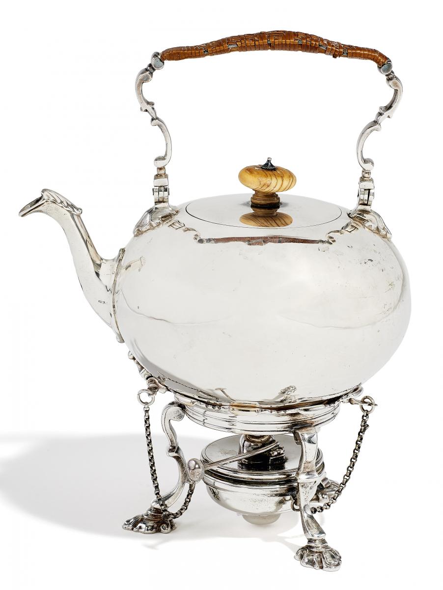 Silber. Griff mit Bastgeflecht und Deckel mit Beinknauf. Rechaud auf drei hohen Füßen und passigem Rand. In Zwischenring Brenner eingesetzt.