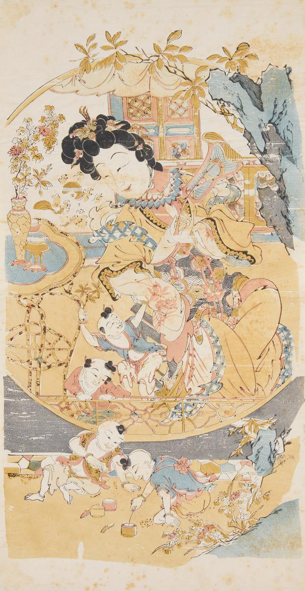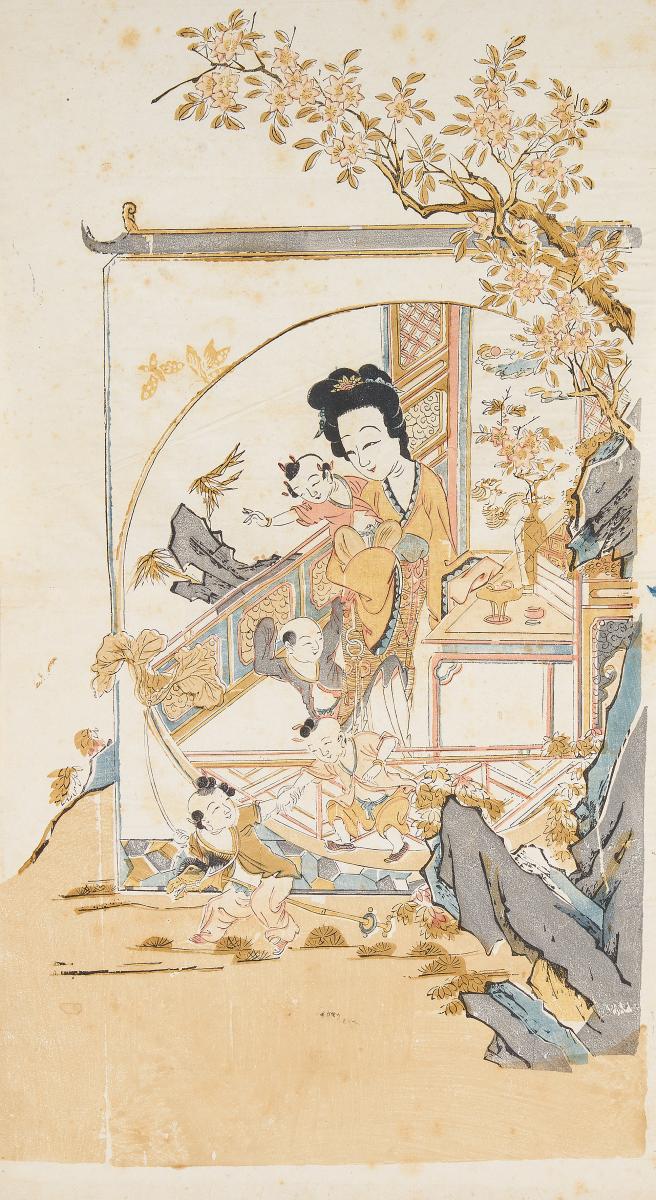 VIER HOLZSCHNITTE IN ZWEI HEFTEN MIT DAMEN UND SPIELENDEN KNABEN.