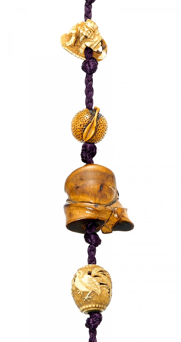 Beschreibung: A) Bambus, stilisierter Frosch. B-D) Elfenbein, teils marines: B) Pfirsich an Blätterstil.