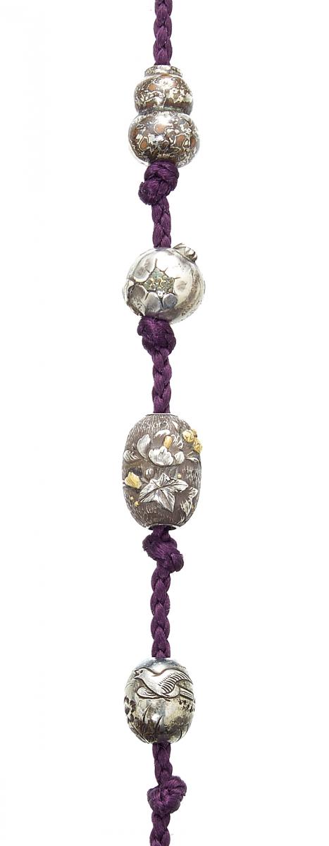 Beschreibung: A) Granatapfel. B) Flaschenkürbis mit Shakudô und Kupfer. C) Mit wenig Gold auf fein
