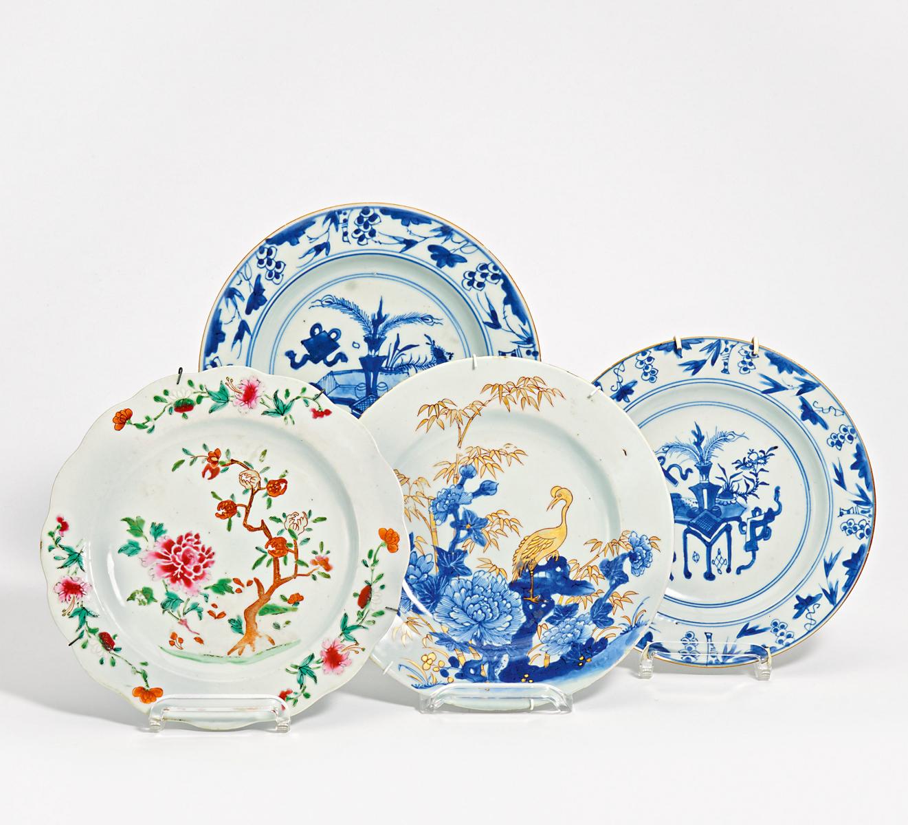 VIER TELLER MIT BLUMEN, VÖGELN UND ANTIQUITÄTEN.