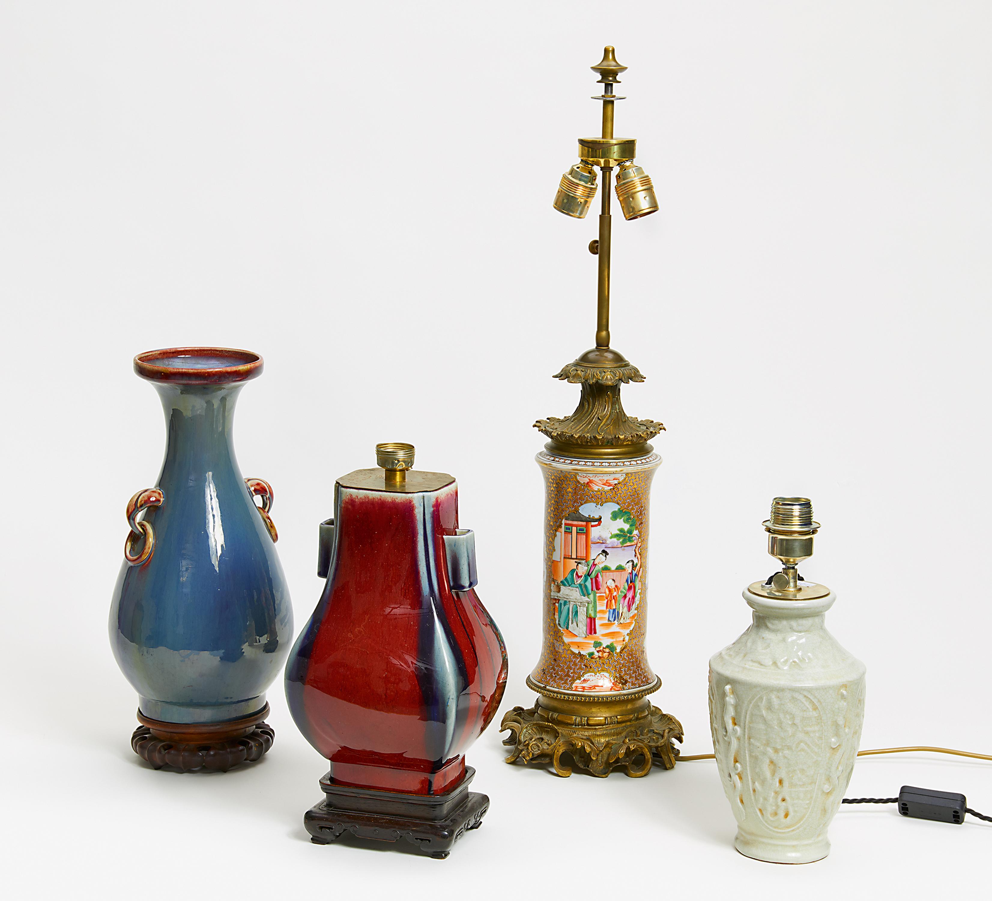 Beschreibung: a) Eckige Vase mit Pfirsich in Relief. Flambé-Glasur. H.30,5cm. 18. Jh. Beschädigt und