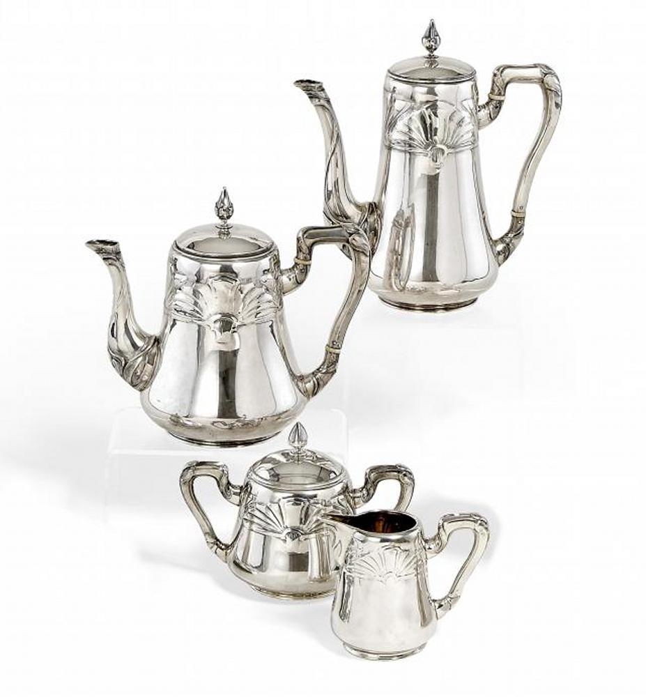 Silber, zweimal mit Innenvergoldung. Bestehend aus Kaffeekanne, Teekanne, Zuckerdose mit Stülpdeckel und Sahnegießer. Jeweils