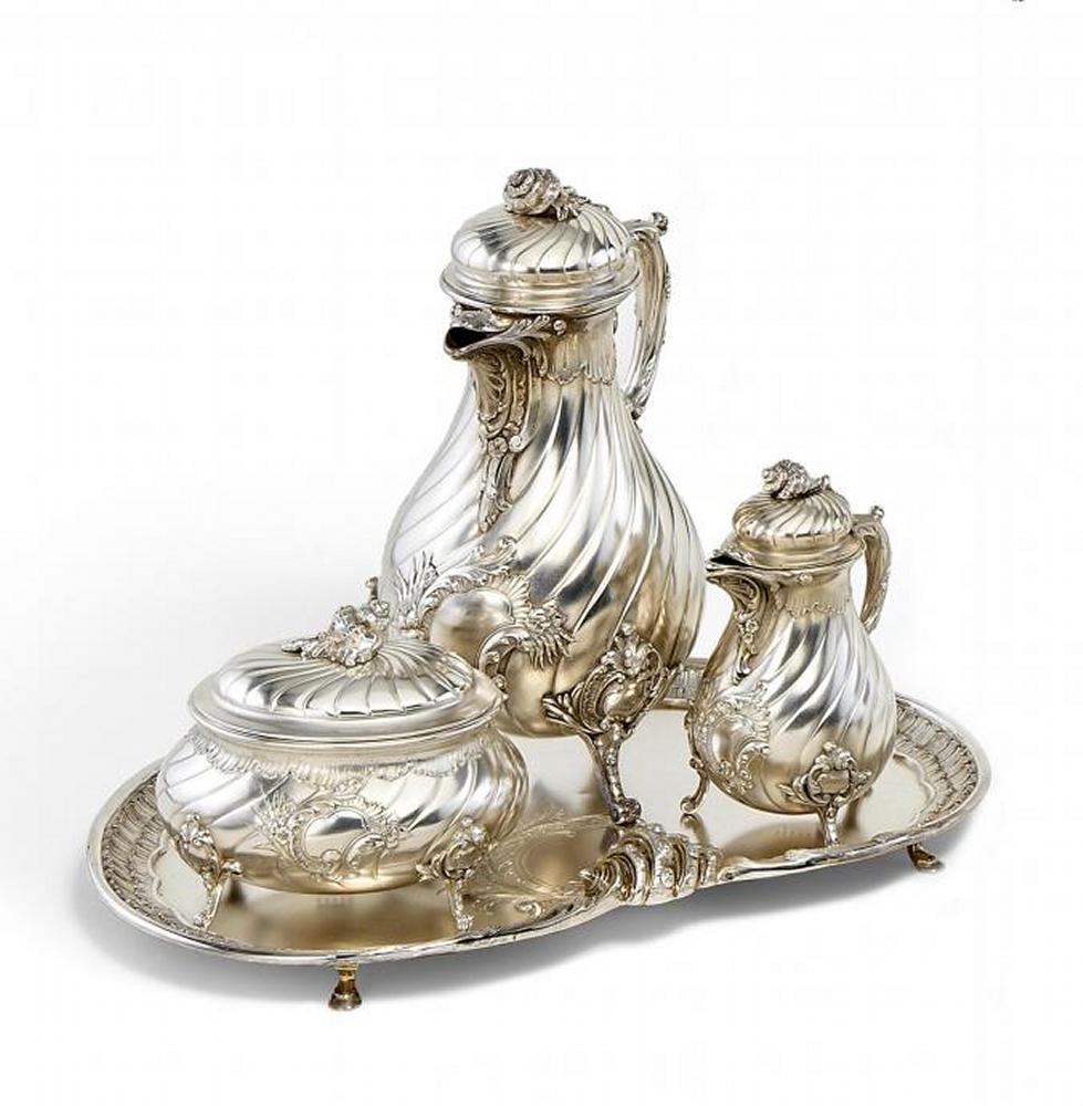 Silber, zweimal mit Innenvergoldung. Bestehend aus Kaffeekanne, Milchgießer, Zuckerdose sowie einem Tablett. Auf vier kleinen