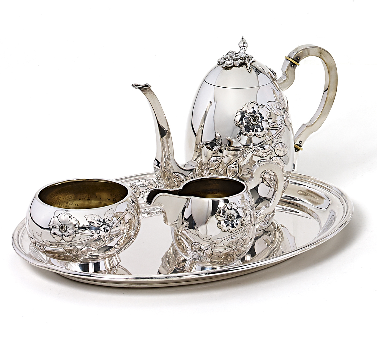 Silber, zweimal mit Innenvergoldung. Bestehend aus Kaffeekanne, Zuckerschale, Milchkännchen und ovalem Tablett. Auf Tablett