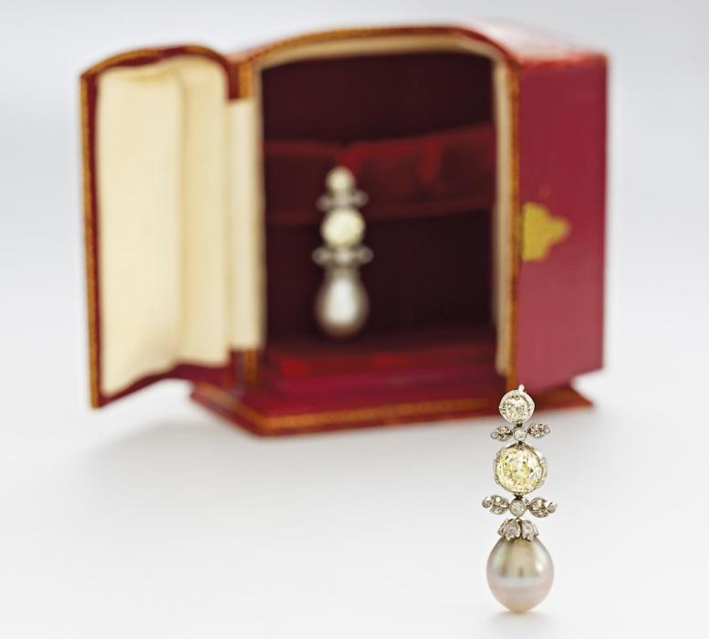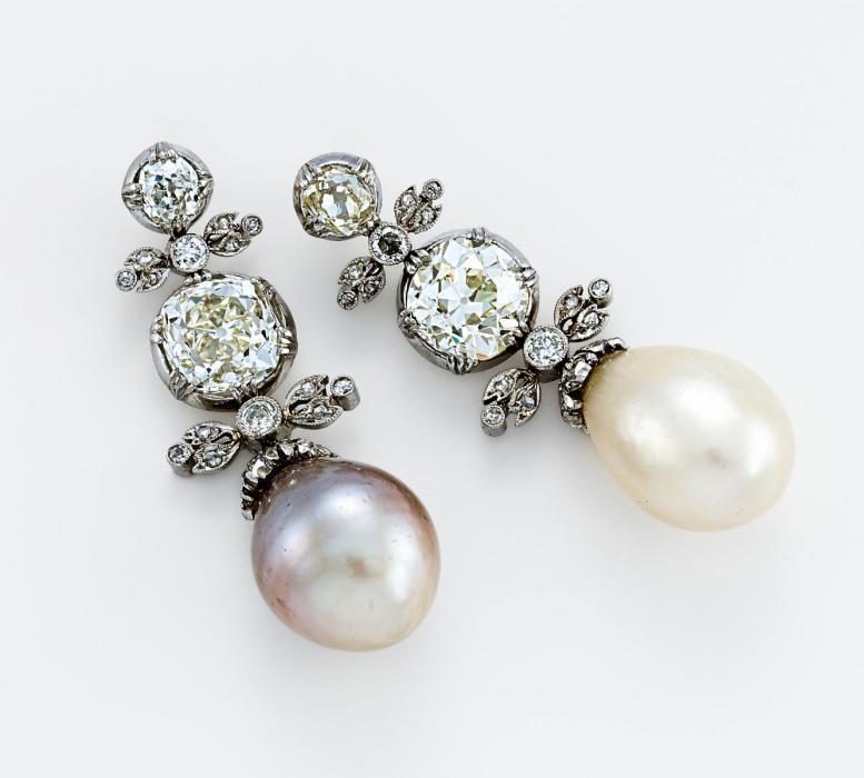 950/- Platin, Stift und Brisur aus 750/- Gelbgold, Gesamtgewicht: 14,7g, 120 grains (Naturperlen). Ca. 4,1cm lang. 4 Diamanten im Cushion Cut, 16 kleine Altschliff-Diamant und 24 Diamantrosen zus.ca. 4,948ct Tchry-Chry(J-L) VS-SI1 Naturperltropfen ca. 11,88-11,91 x 14,90mm, Körperfarbe: weiß, Überfarbe: getöntes weiß-irisierendes rosé; 1 Naturperltropfen ca. 12,12-12,47 x 13,40mm, Körperfarbe: hellgrauÜberfarbe: zartes silbrig grau mit irisierenden rosé.