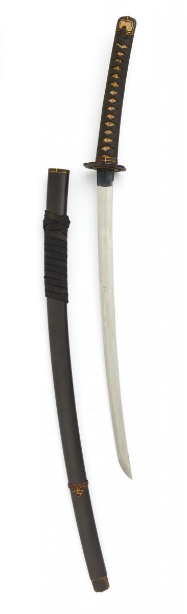 Beschreibung: Kotô-Klinge in Shinogi-zukuri-Form, mit iori-mune, chu-kissaki, torii-sori, 52,3 (66,9) cm. Unsigniert. Jihada: mokume. Großer Schmiedefehler (fukure). Hamon: notare. Bôshi: midare-komi. Habaki: Shakudô. Nakago: ô-suriage mit kiri-yasurime, 1 mekugi-ana.