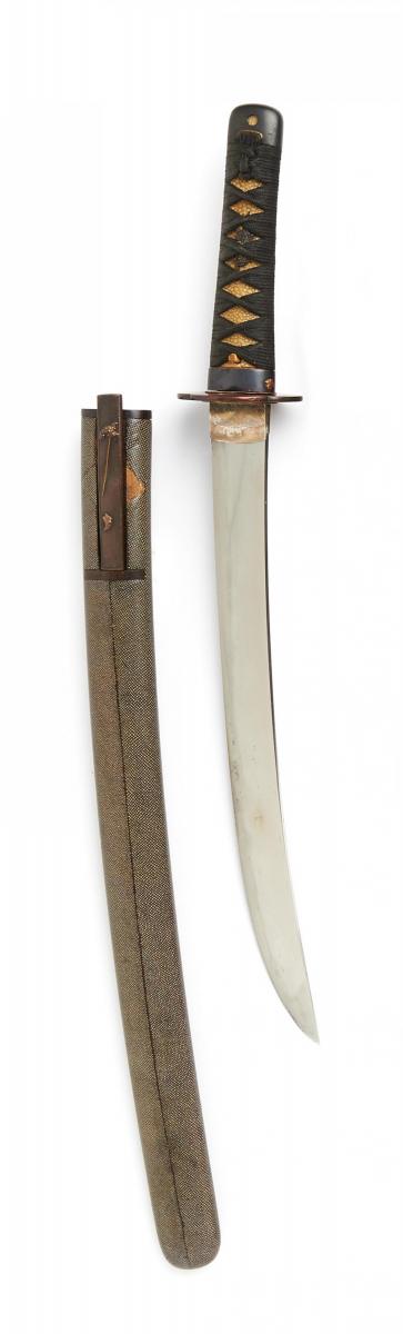 Beschreibung: Kotô-Klinge in Hira-zukuri-Form, mit iori-mune, torii-sori, 35 (45,5)cm lang. Sign.: