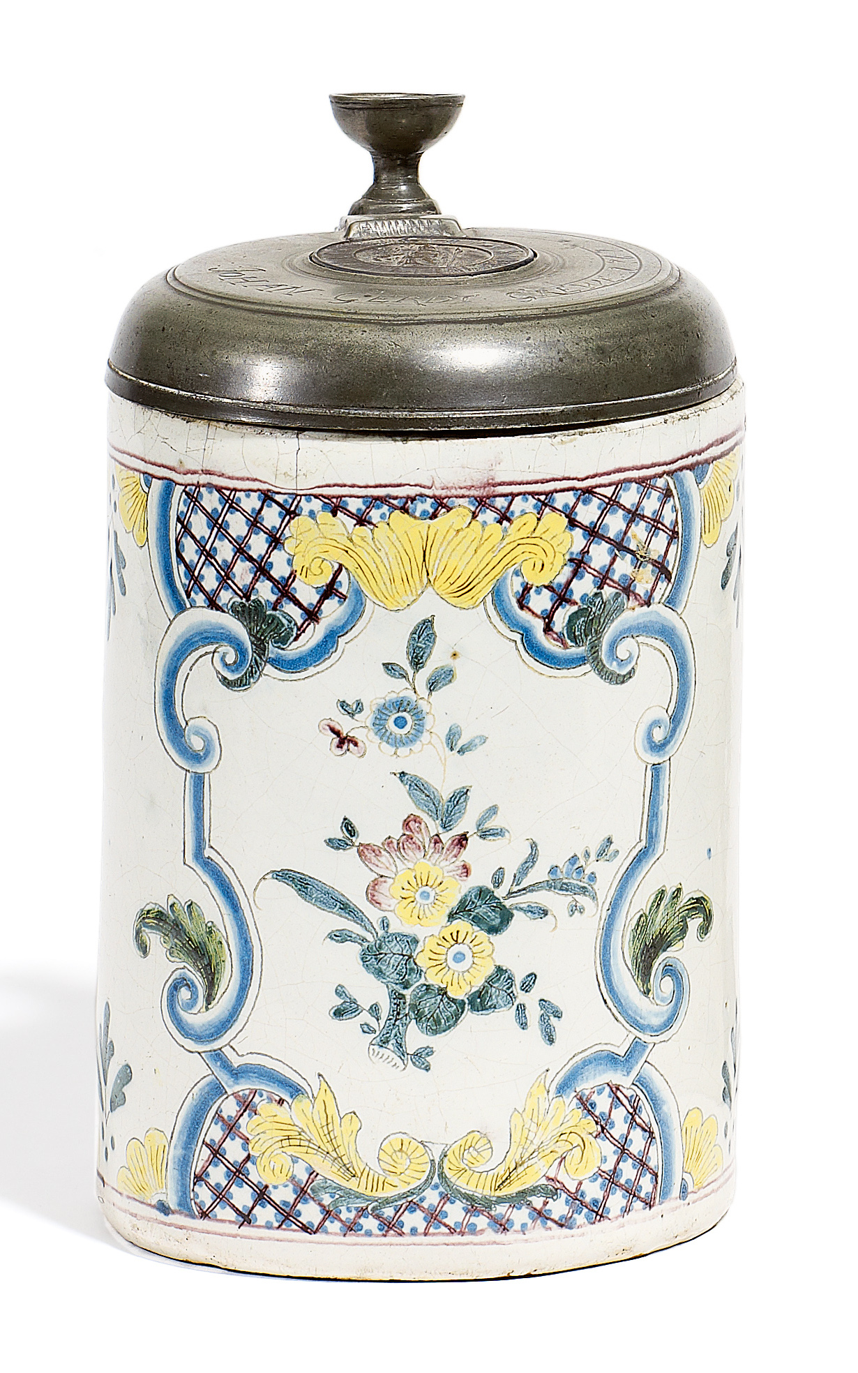 Beiger Scherben mit weißer Glasur und pastellfarbenem Dekor mit dunklen Konturen. Scharnierter Zinndeckel. Höhe 21cm. Marke auf der Bodenunterseite V/B in Mangan18. JahrhundertDeckelscharnier mit starkem SpielZustand C.