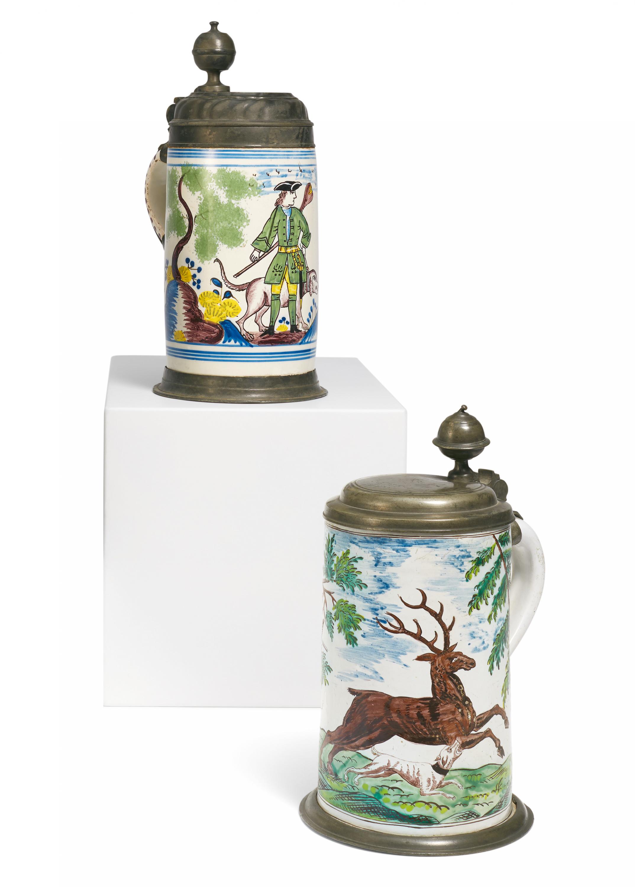 WALZENKRUG MIT HIRSCHJAGD UND WALZENKRUG MIT JÄGER UND SEINEM HUND.