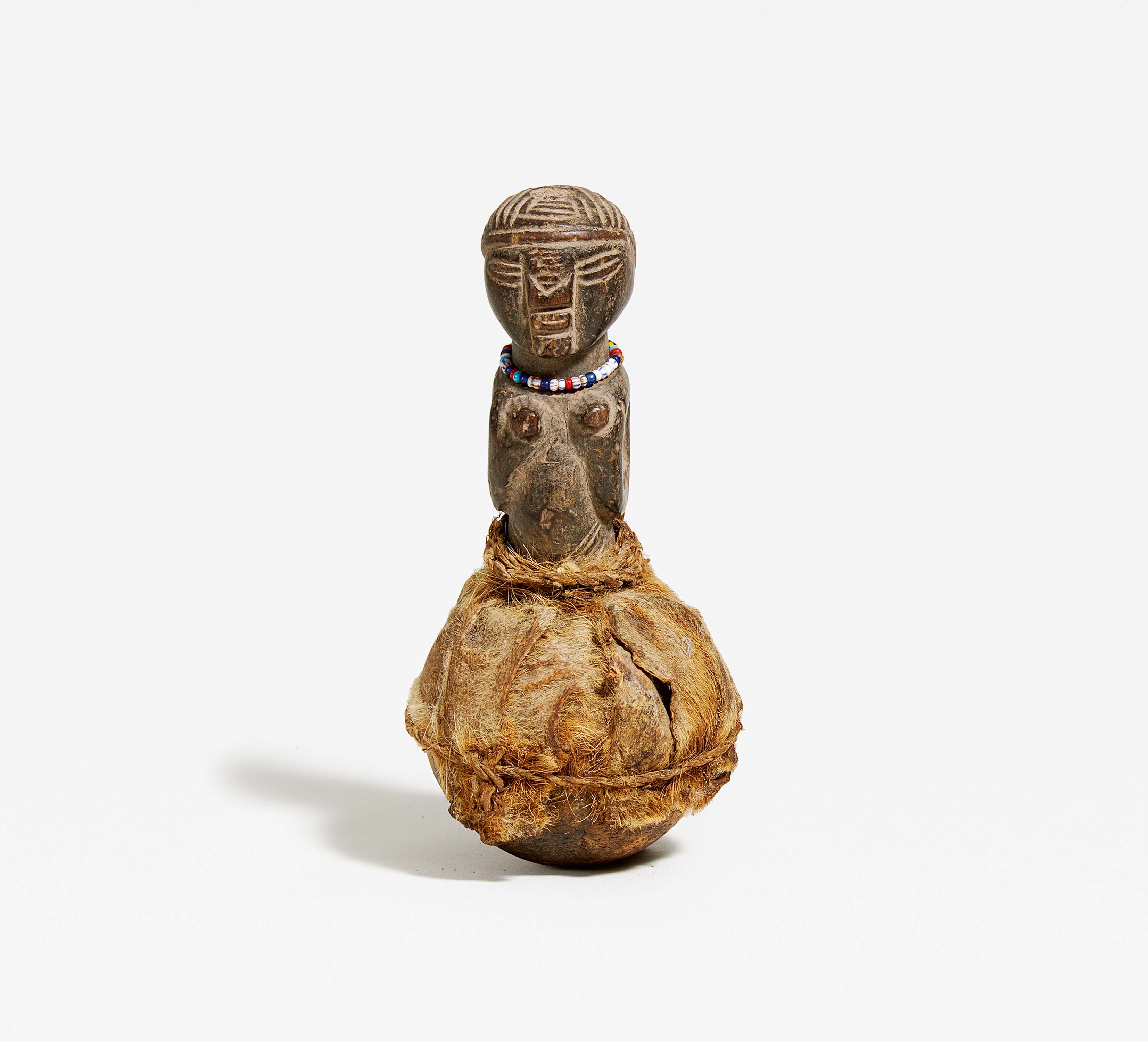 Bei dieser Schutzfigur der Luba bilden die kleine weibliche Skulptur und das Bündel mit magischem Material eine Einheit. Ablesbar wird hier der hohe Stellenwert, den Frauen in dieser Ethnie des Kongo genießen. Fast immer sind es weibliche Darstellungen, die im figuralen Werk der Luba-Schnitzer auftauchen. Zudem ist dieser Stil an den runden Formen vor allem des gewölbten Kopfes zu erkennen. Die magische Masse unbekannter Zusammensetzung ist in einem ledernen Bündel zusammengeschnürt, das von dem Frauen-Figürchen gekrönt wird.