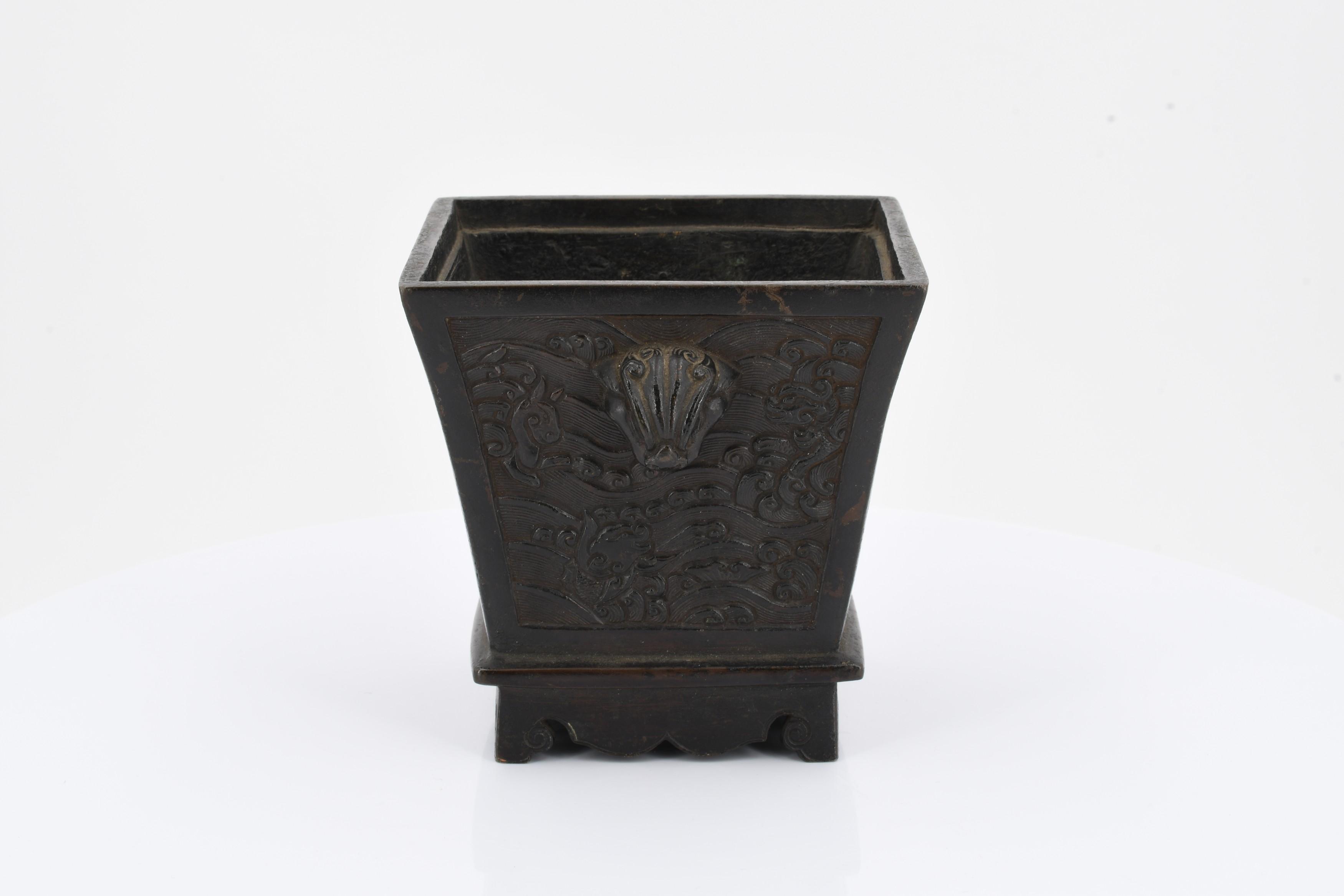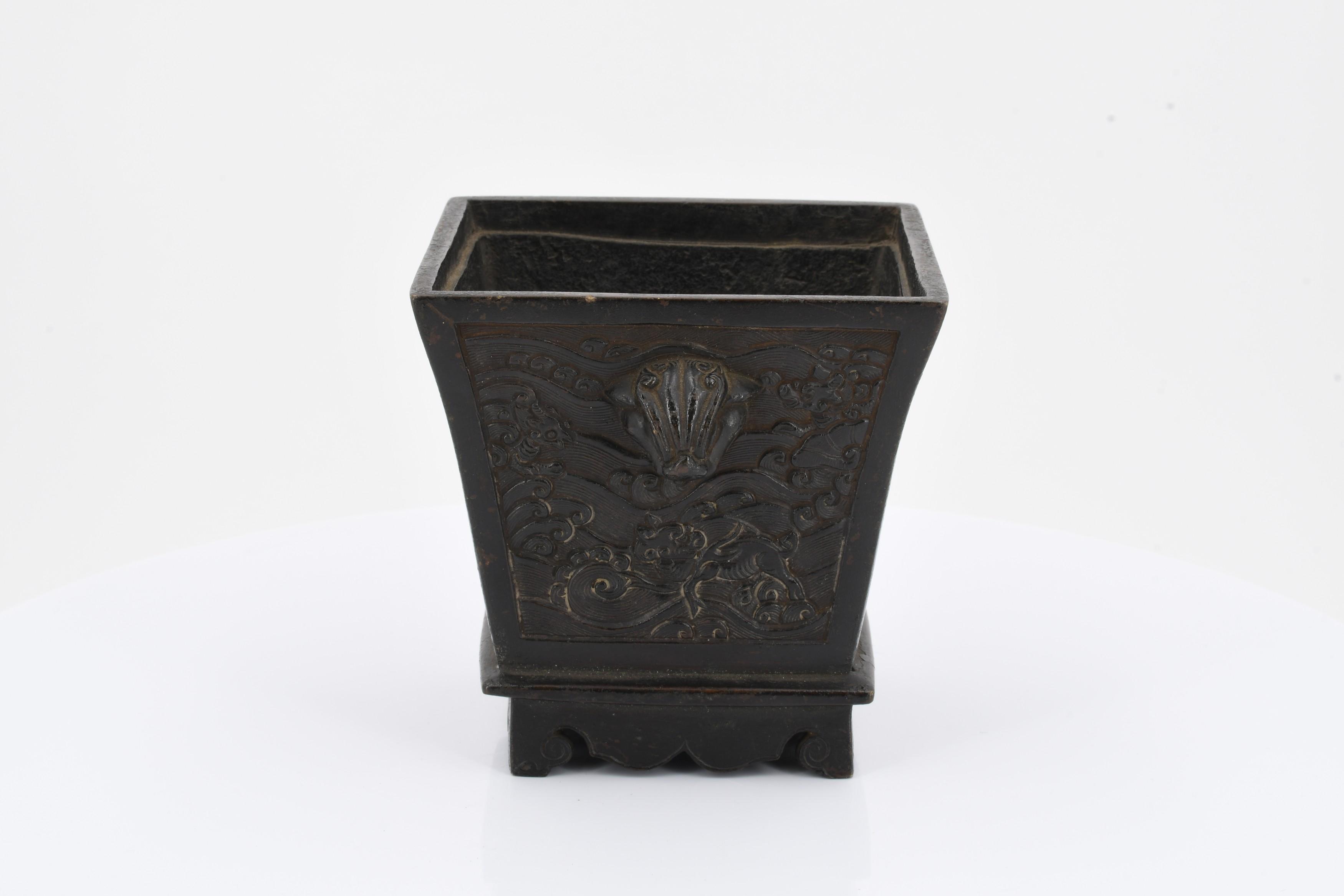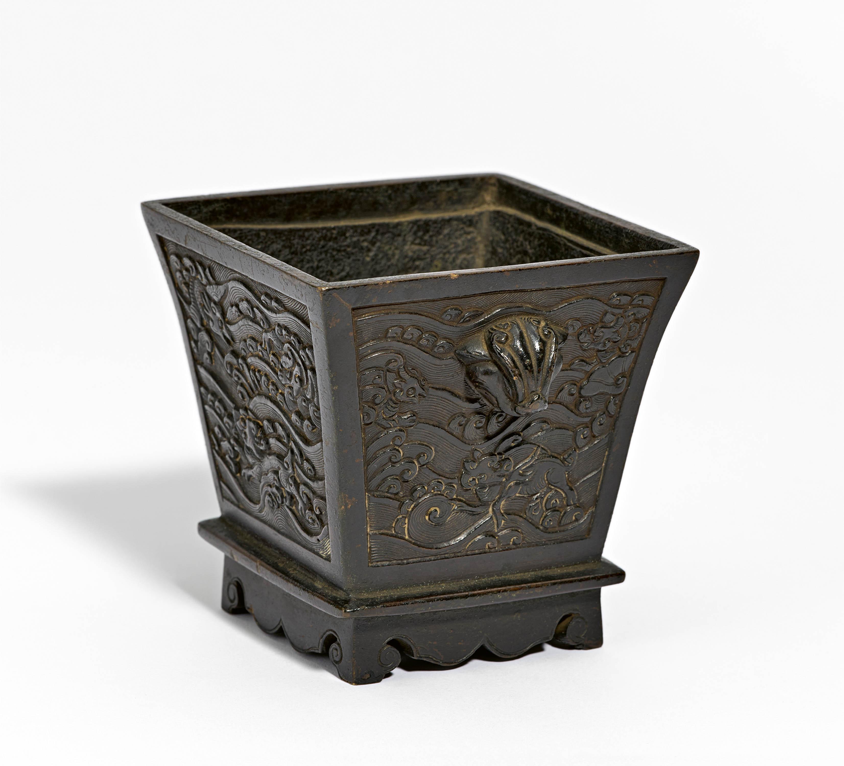 mit gegossenem Relief in Form von Fabeltieren über Wellen. Reste einer schwarzbraunen