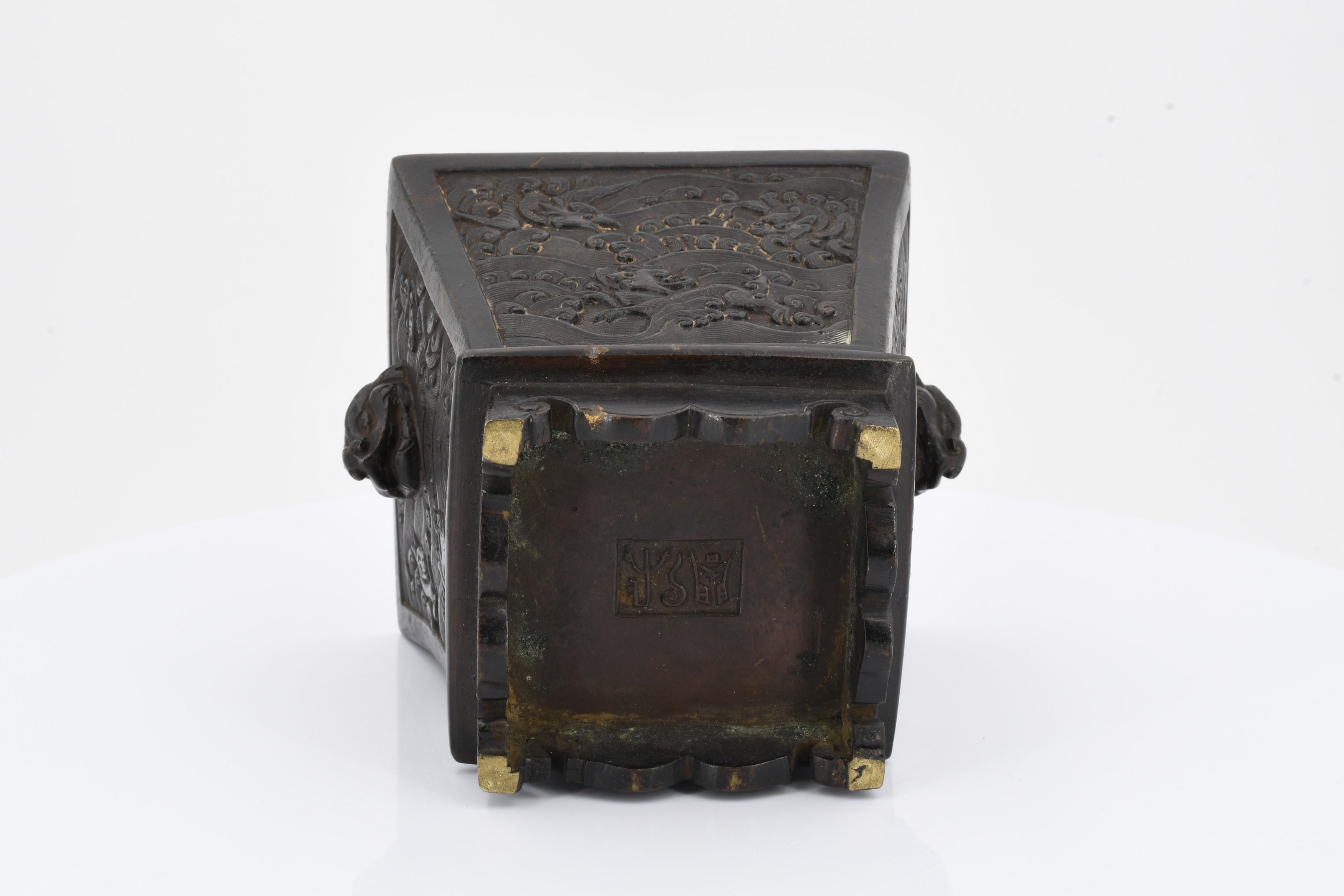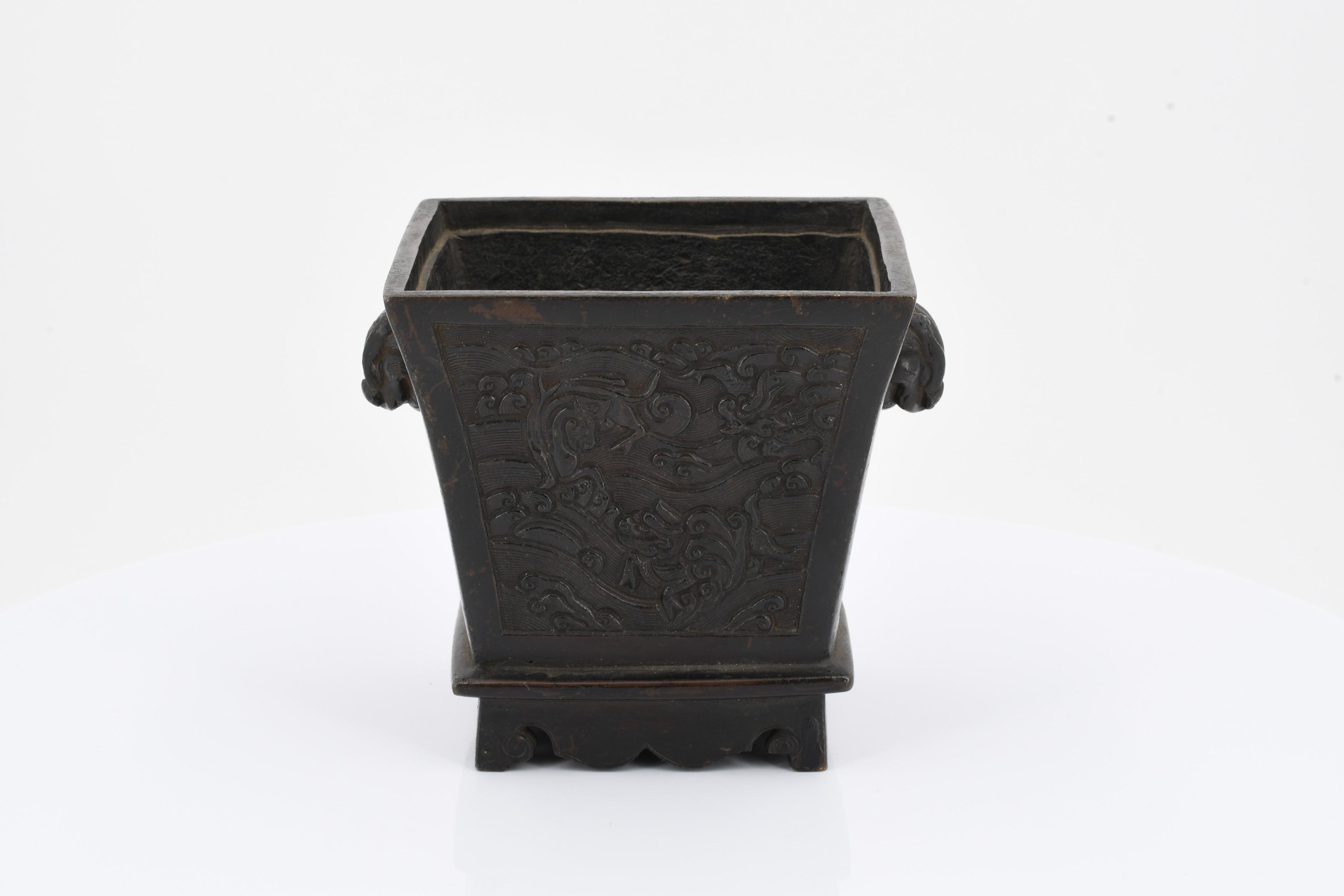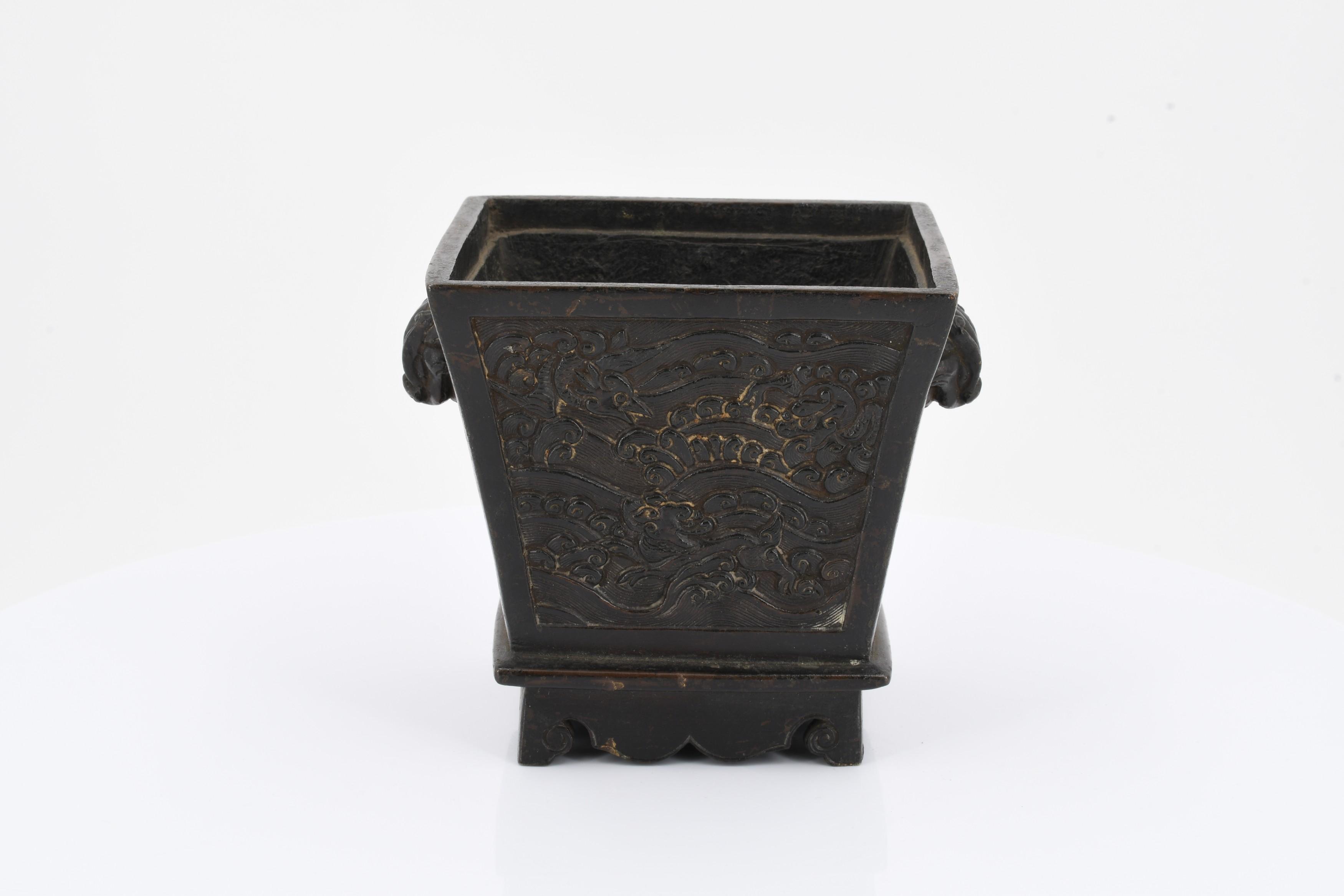 mit gegossenem Relief in Form von Fabeltieren über Wellen. Reste einer schwarzbraunen