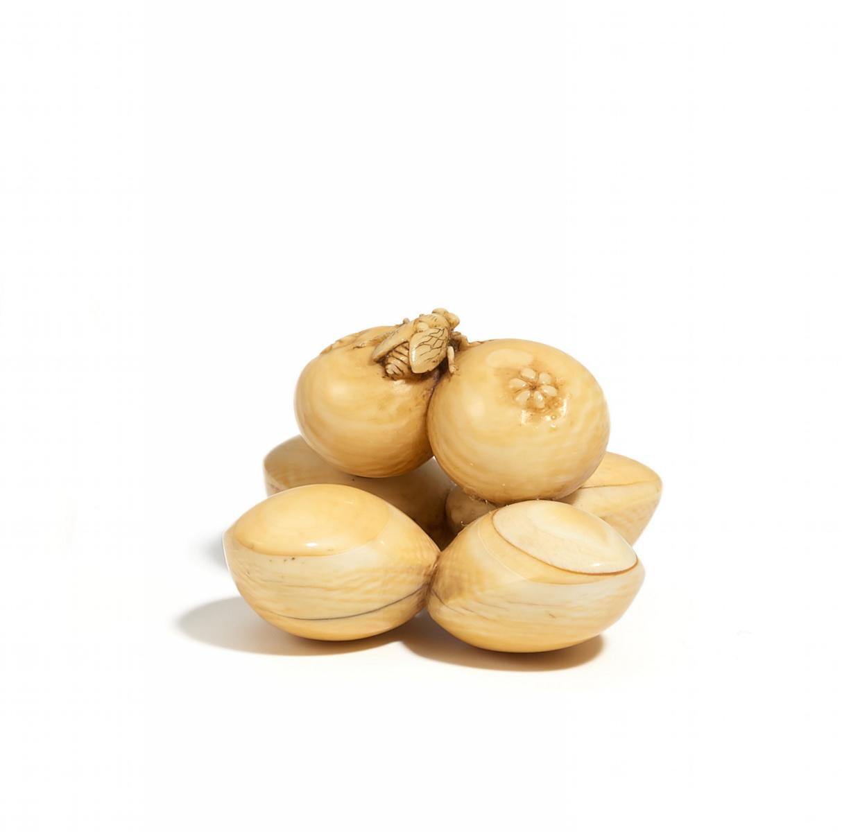 Beschreibung: Eine fein geschnitzte Wespe sitzt auf zwei Kaki-Früchten, die auf vier Ginkgo-Nüssen