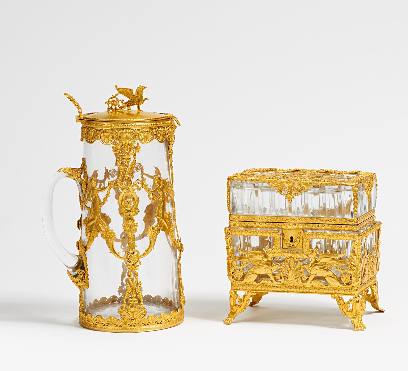 ZIERSCHATULLE MIT SPHINGEN UND WEINKARAFFE.