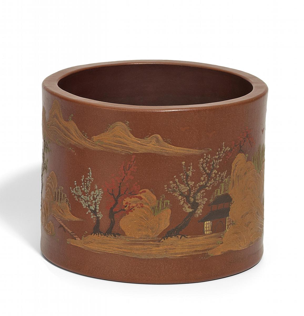 Beschreibung: Runder Becher bemalt mit umlaufender Landschaftsmalerei in Rot, Grün, Gelb und Schwarz.