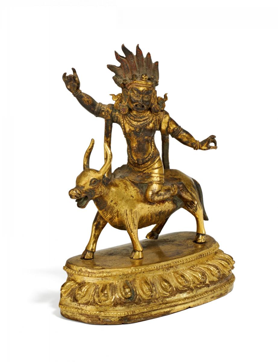 Beschreibung: Mittig auf einem Ochsen sitzend und nur um die Hüften bekleidet. Den nackten Oberkörper ziert Schmuck und das Haupt mit flammendem Haar wird von einer Schädelkrone bekrönt. Beide Arme von sich gestreckt, hielt die Figur vermutlich ein Attribut in der rechten Hand.