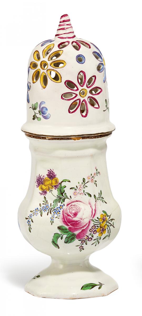 Beiger Scherben mit weißer Glasur und polychromem Muffeldekor. Gefußter, birnförmiger Korpus mit facettierter Wandung. Hals mit Schraubgewinde. Der hohe
