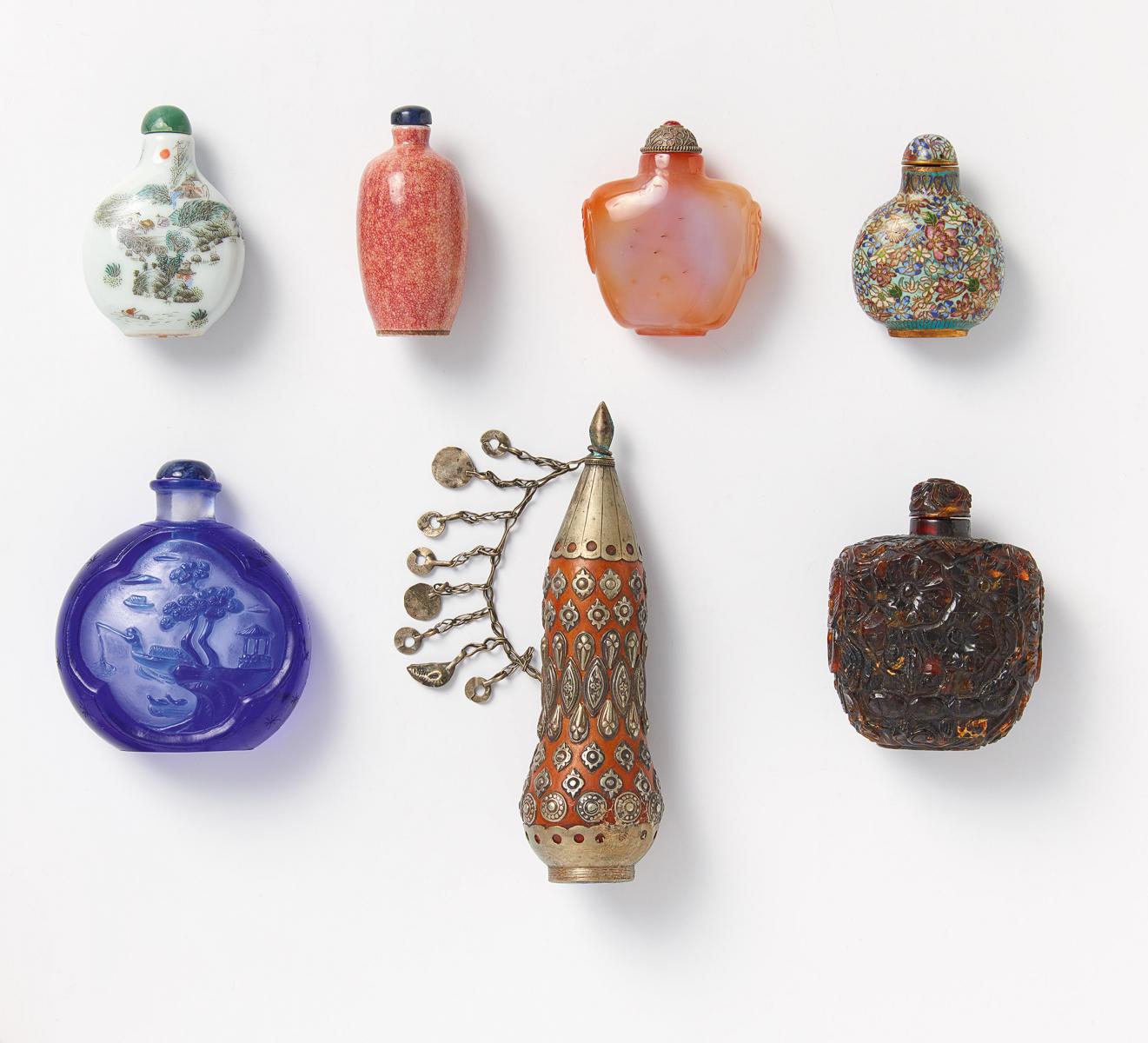 Technik: 8x Cloisonné, 5x Stein, 4x Porzellan, 1x Kürbis mit Metallauflagen (eine fehlend), 1x Bernstein, 1x Überfangglas.