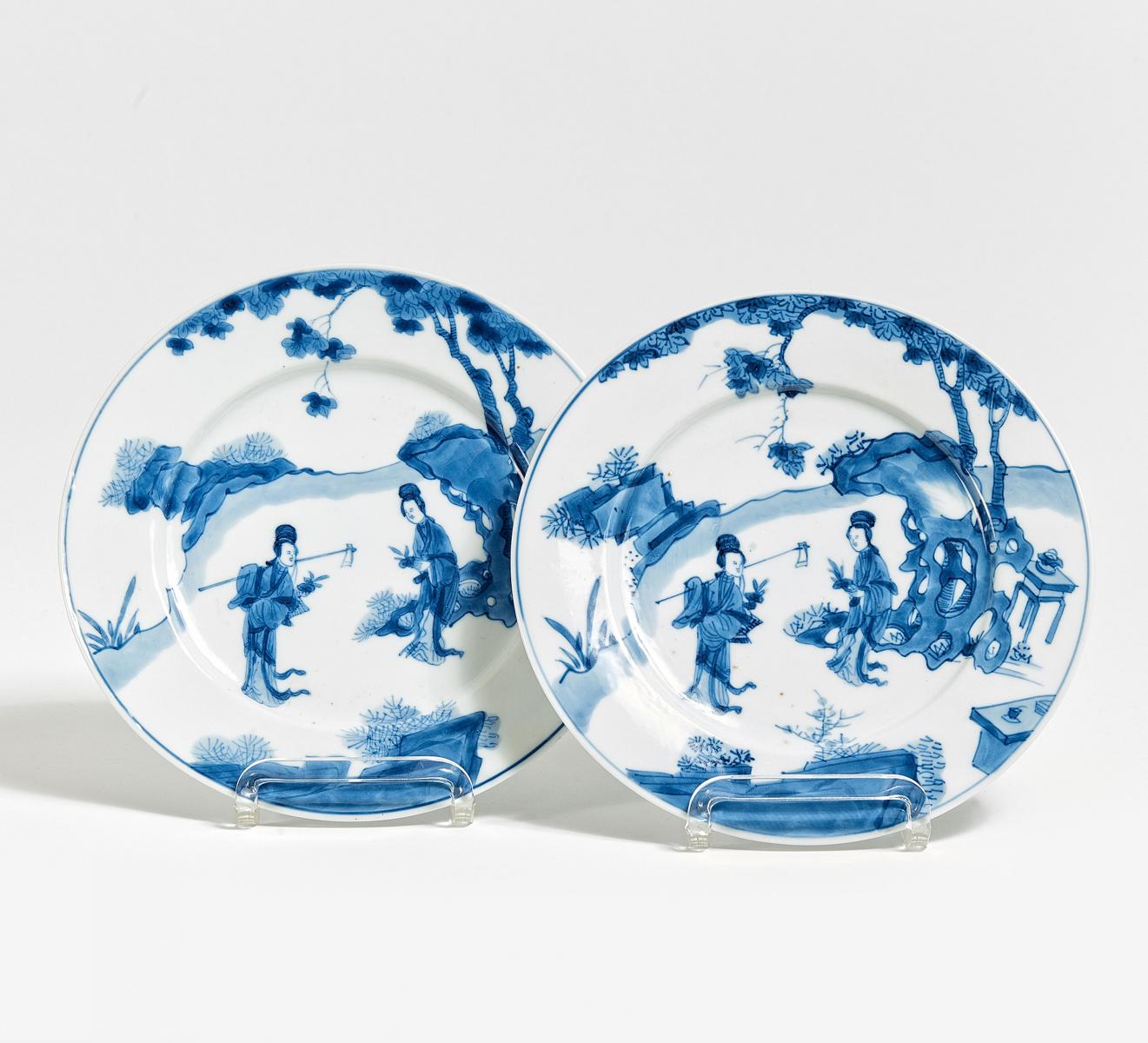 Zwei ähnliche Teller mit Damen im Garten.