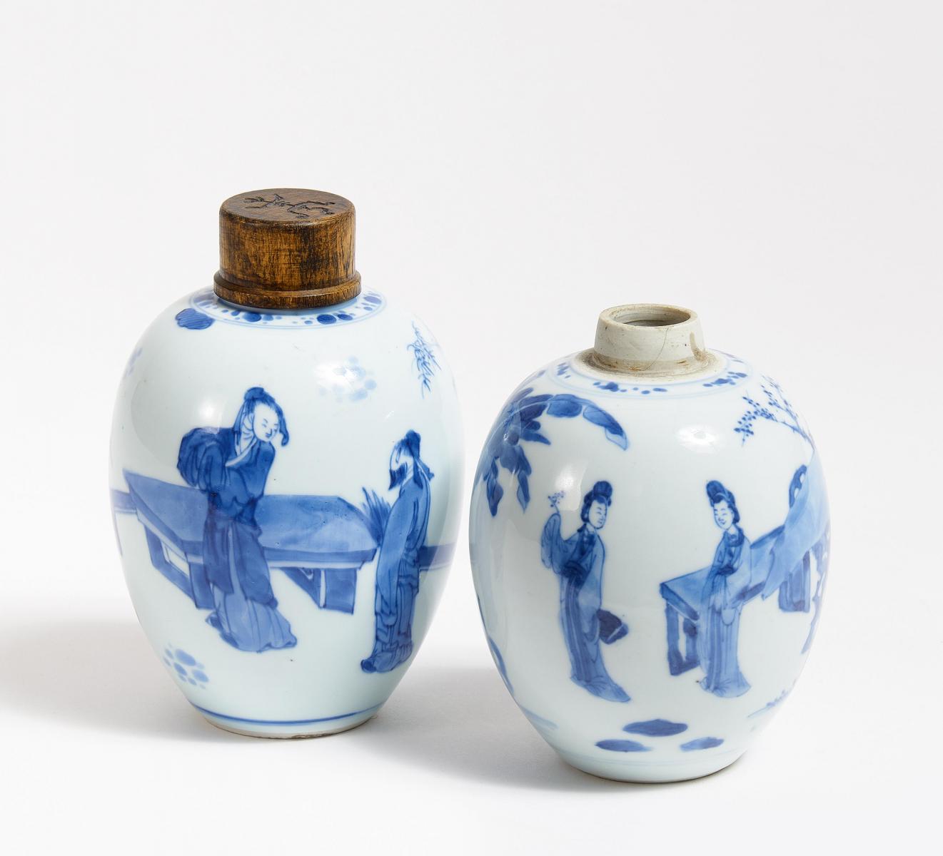 Zwei ähnliche Töpfe mit Damen und Gelehrten.