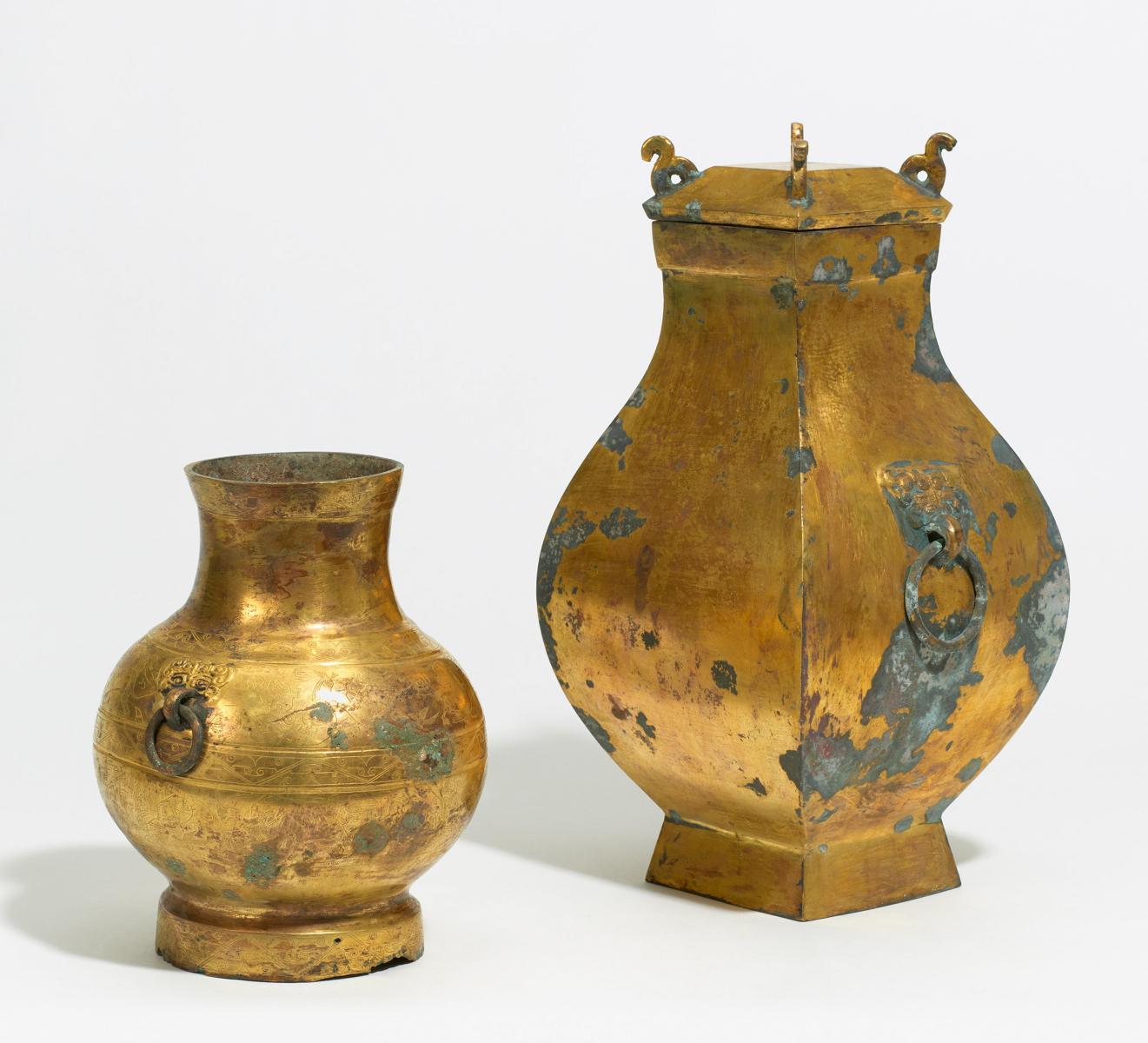 Technik: Bronze mit stabiler Vergoldung. Beide mit Ringhenkeln in Reliefmasken.