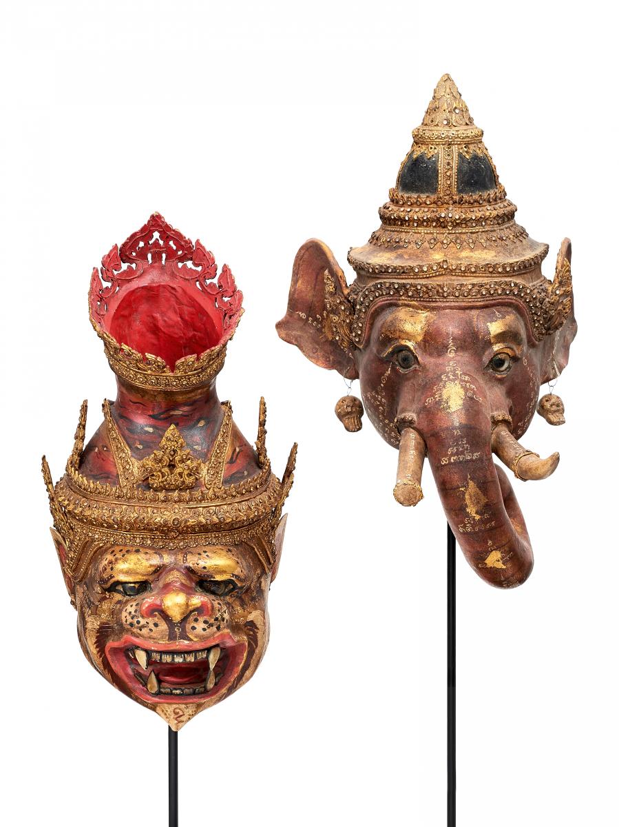 Die exzellente Qualität der beiden Masken lässt auf die Verwendung in einem höfischen Khon-Ensemble schließen.