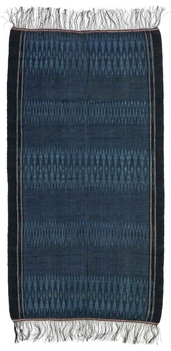 Beschreibung: A) ulos sibolang, zeremonielles Schultertuch der Batak, Blau mit pfeilförmigem Kettikat