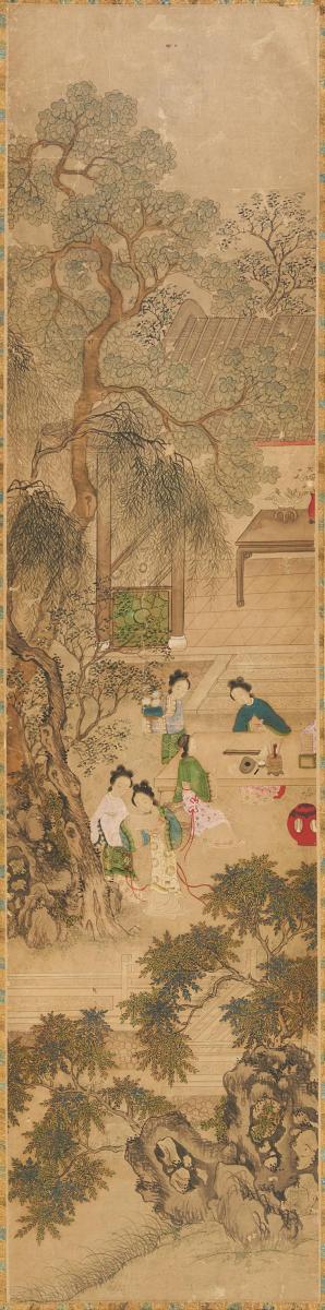 Gartenlandschaft. Wohl zwei der 'Vier Fertigkeiten' der Damen, die da sind: Auf der Zither