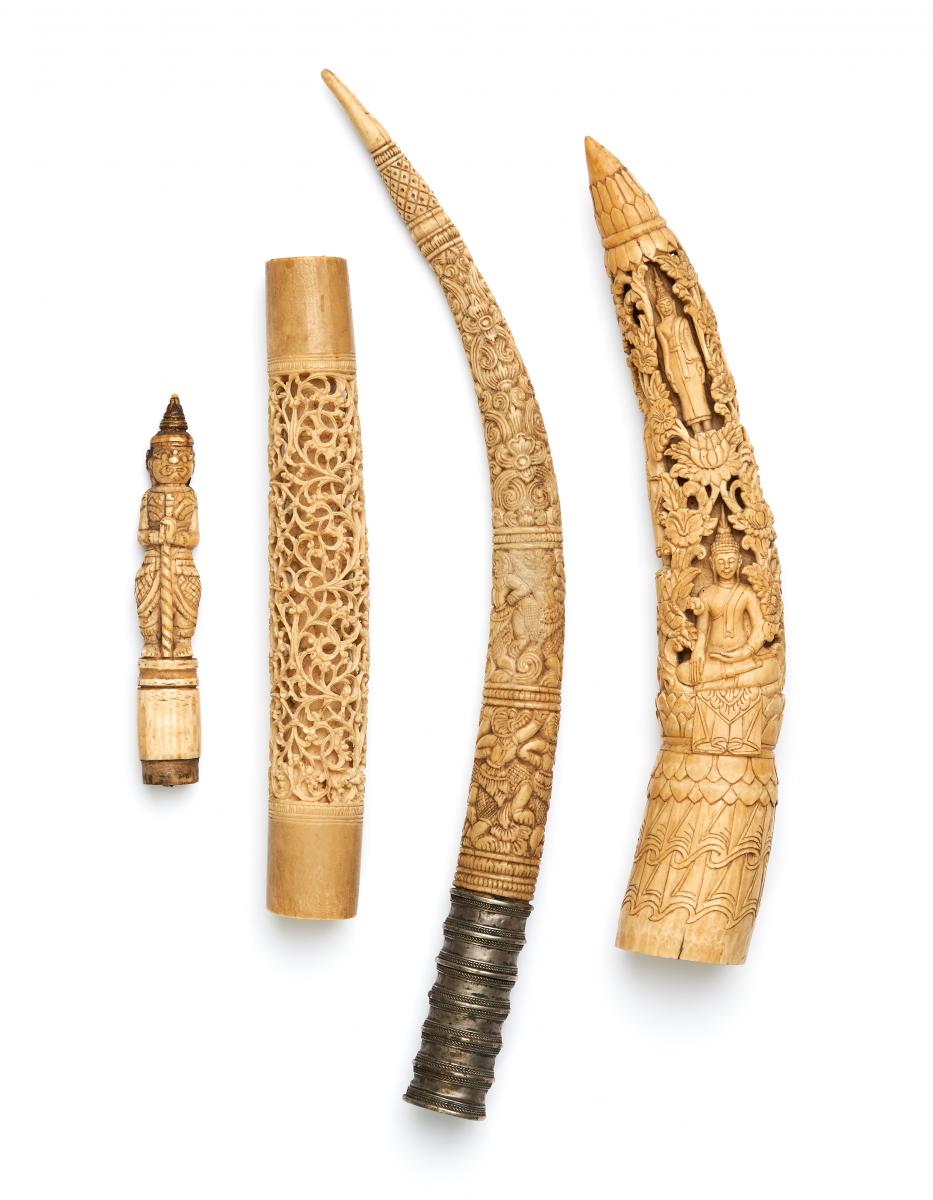 ZWEI ELEFANTEN-STOßZÄHNE UND ZWEI GRIFFE FÜR DHA-SCHWERT UND -MESSER.