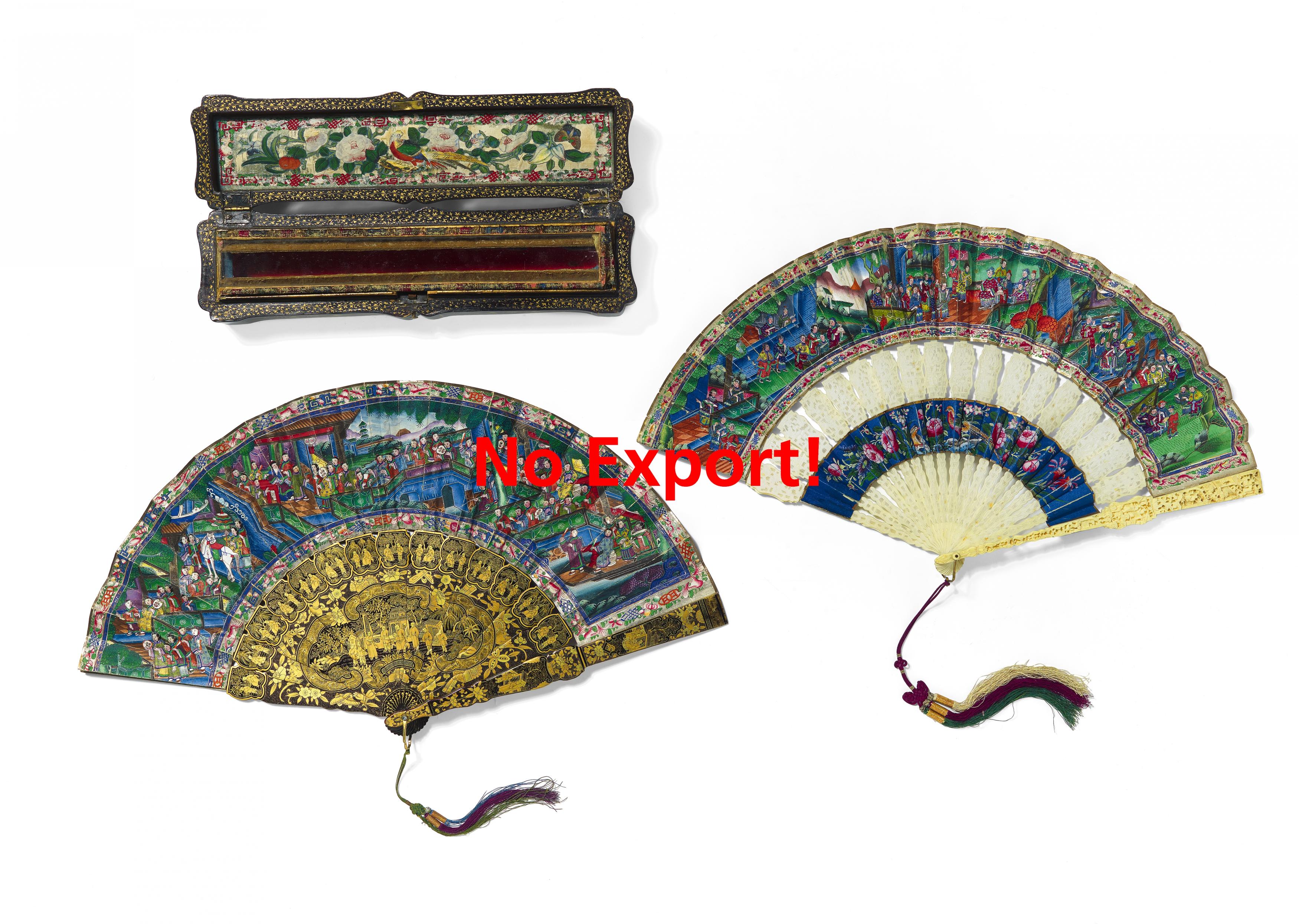 Elfenbeingesichter. L.28cm, B.52,5cm. Seidenquaste. Original-Schatulle Kanton-Lack,