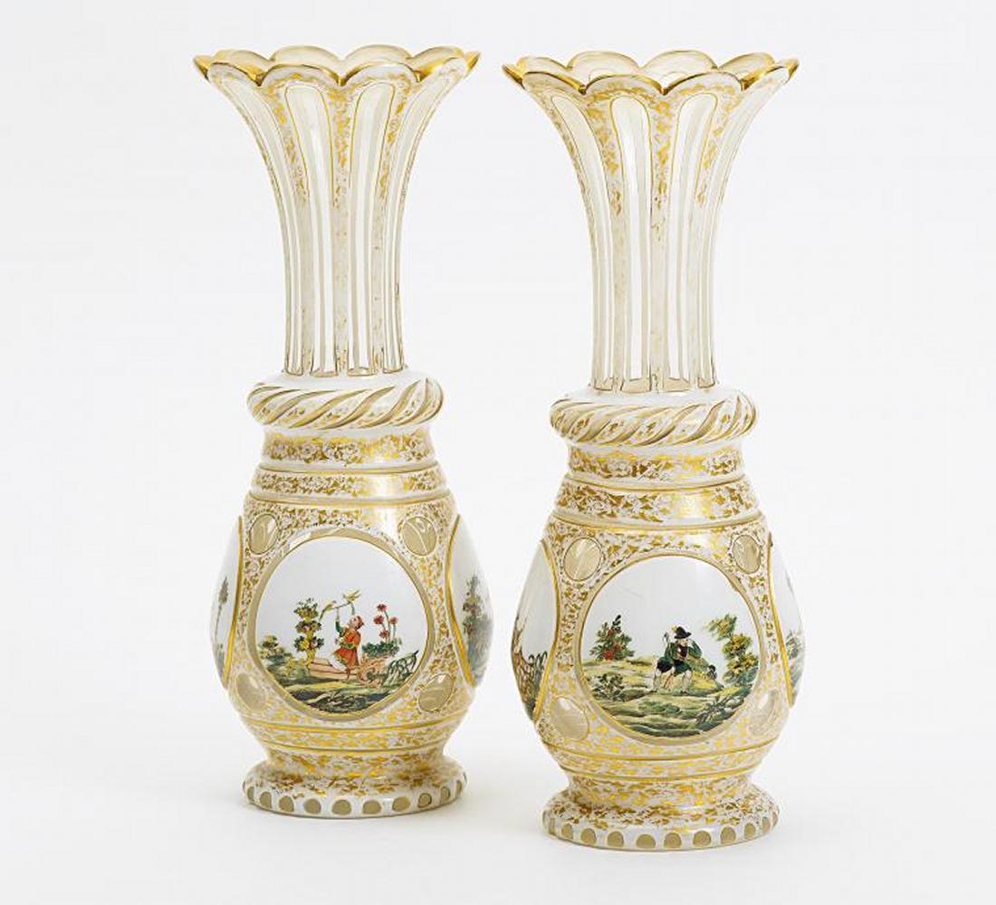 Farbloses Glas, farbig und gold staffiert. H.42 cm.